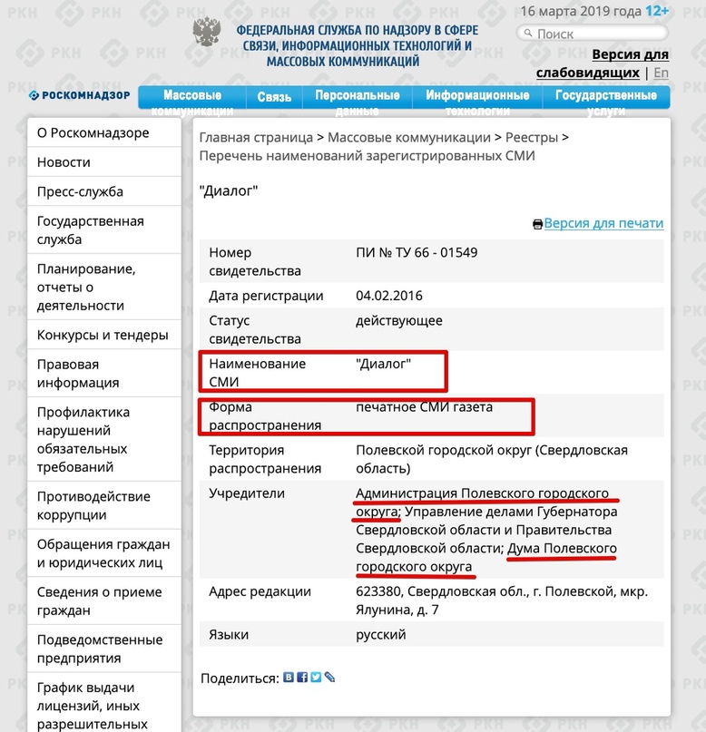 На самом деле, как видно из скрина Роскомнадзора, Диалог отчасти принадлежит мэрии Полевского, находящейся под контролем СТЗ. Так что в плане СМИ счет не 3-1, а 3,9 - 0,1.